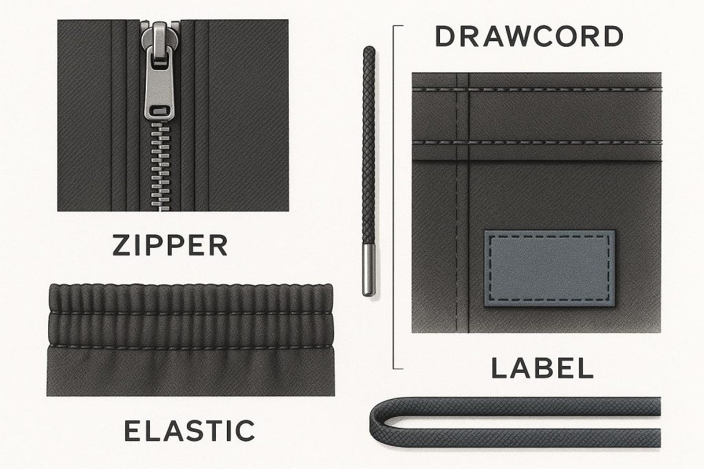 Clear checklist for documenting trims in activewear tech packs: names, sourcing, materials, color/size specs, placement, attachment methods, and lead-time notes.